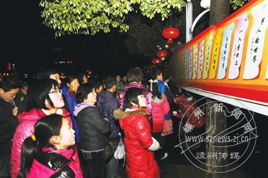 昨天是元宵节,晚上,由市委宣传部和市文广新局主办的“卯兔纳福、开局织彩”元宵灯会、灯谜竞猜活动在市区文化广场举行。活动的主题是“我们的节日”。广场中间几个大灯箱上,介绍了有关元宵节的民族传统、有关元宵节的诗词、市委全体(扩大)会议和全市工业经济大会解读等内容。广场周围展示了各式各样的彩灯,广场东侧入口处,是元宵灯谜长廊。市民们兴致勃勃地前来赏花灯、猜灯谜,一派喜庆的场面。