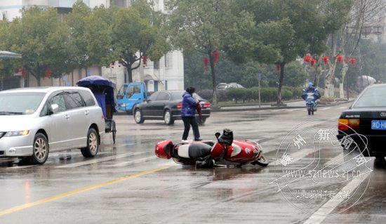 昨日上午,在市区嵊州宾馆门口发生一起交通事故,一辆汽车与电动车相撞。