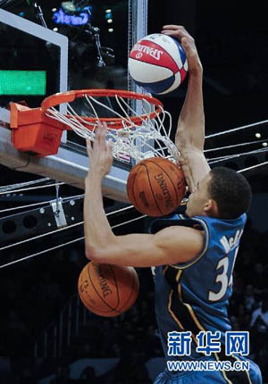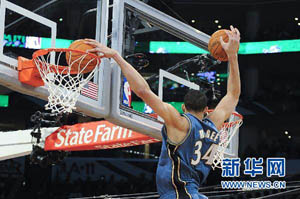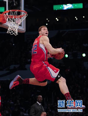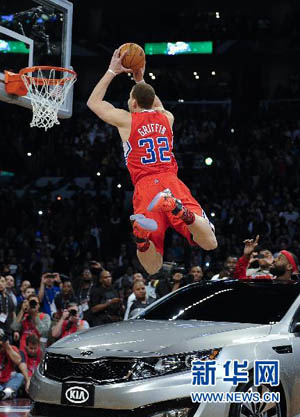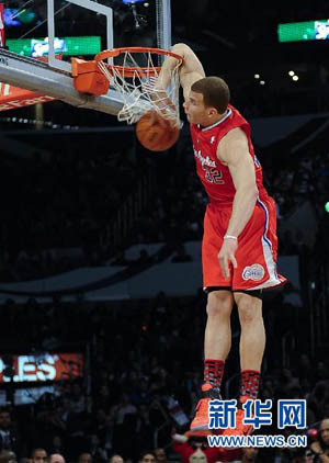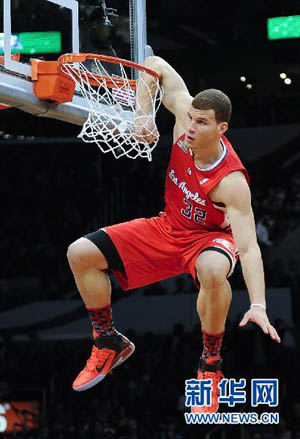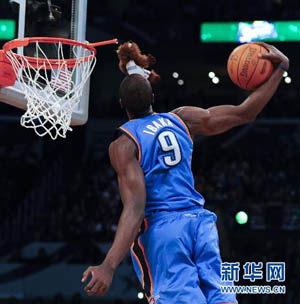 2月19日,来自俄克拉荷马城雷霆队的伊巴卡跃起扣篮,并用嘴叼下挂在篮筐边的玩具。当日,2011年NBA全明星周末扣篮大赛在美国加州洛杉矶举行。在引人瞩目的扣篮大赛中,来自洛杉矶快船队的格里芬以精彩表现荣膺扣篮王。新华社记者戚恒摄