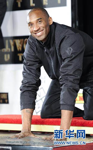 2月19日,科比在留下手印时面向镜头微笑。当日,NBA球星科比在美国加州好莱坞的中国剧院前广场留下手印和脚印,成为第一位在此留下手印和脚印的运动员。好莱坞中国剧院前广场布满了为娱乐业做出杰出贡献的人士的手印和脚印,是美国著名的旅游景点。新华社记者戚恒摄
