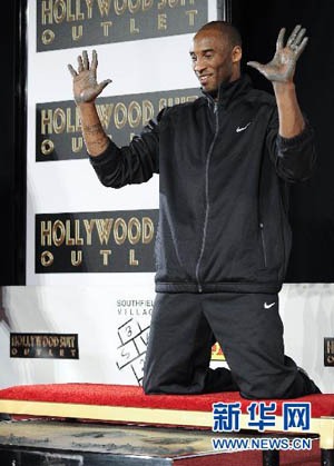 2月19日,科比展示留下按过手印的双手。当日,NBA球星科比在美国加州好莱坞的中国剧院前广场留下手印和脚印,成为第一位在此留下手印和脚印的运动员。好莱坞中国剧院前广场布满了为娱乐业做出杰出贡献的人士的手印和脚印,是美国著名的旅游景点。新华社记者戚恒摄