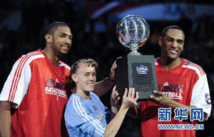 2月19日,亚特兰大队斩获投篮冠军,高捧奖杯。当日,2011年NBA全明星周末在美国加州洛杉矶举行。在投篮挑战赛中,由史蒂文·科尔、霍福德和科科·米勒组成的亚特兰大队夺得第一名。新华社记者戚恒摄
