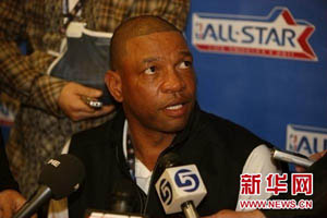 2月18日,东部全明星队教练、波士顿凯尔特人队主教练多克·里弗斯在接受采访。当日,2011年NBA全明星赛在美国洛杉矶举行,全明星球员集体亮相接受媒体采访。新华社发(宋穹摄)