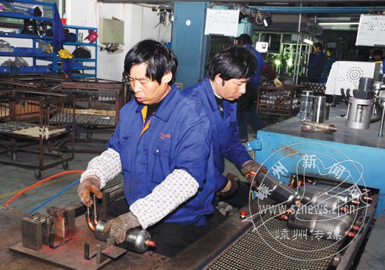 市新高轮制冷设备有限公司通过加大技改,取得了立竿见影的效果。去年来,该公司技改投入400多万元,进行设备自动化改造,节省了劳动力成本,提高了产品质量。今年来,销售收入同比增加30—40%,全年订单都已排满。图为该公司储液器装配生产线。
