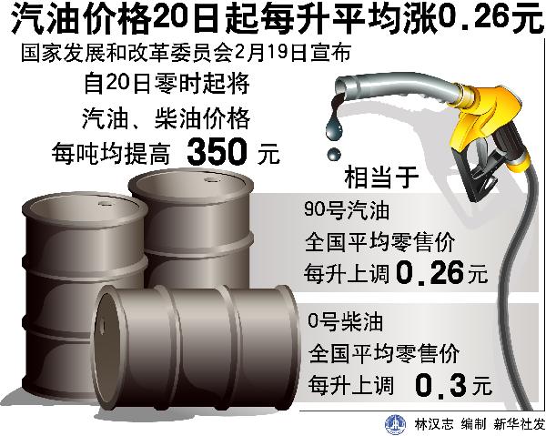 近日,国家发展改革委发出通知,决定自2月20日零时起将汽、柴油销售价格每吨提高350元,全国平均90号汽油和0号柴油每升分别提高0.26元和0.3元。就此,记者采访了国家发展改革委有关负责同志。