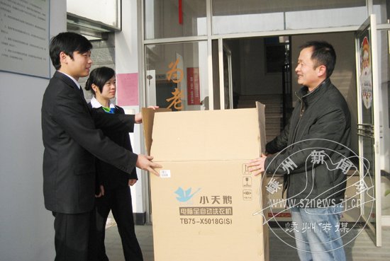 图为该行员工将洗衣机送给阳光山庄的场景。