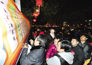 正月十五晚上,嵊州城市广场张灯结彩,万人观灯赏灯。嵊州市委宣传部和该市文广新局主办的“卯兔纳福、开局织彩”元宵灯会、灯谜竞猜活动在这里举行。广场周围展示了各式各样的彩灯,广场东侧入口处,是元宵灯谜长廊,市民们正兴致勃勃赏花灯、猜灯谜,一片喜庆。