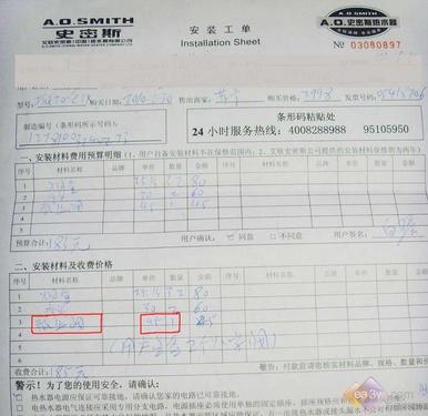 在一位消费者出示的史密斯热水器安装材料价目表上,笔者发现列出多种收费材料项目,单价与市场上同等材料相比,要高出一大截。