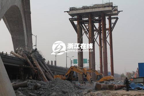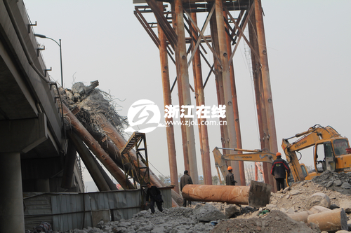 一位工人告诉记者,这些钢管都是要拆除的,在拆除工程中钻孔打偏了,才导致钢管集体向南面倾倒,最终砸毁桥面。