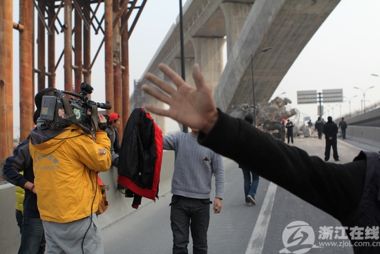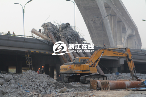 浙江在线杭州2月23日讯(记者童俊 徐晓)2月23日上午10时许,记者接到网友报料,称杭州一高铁工地的龙门架倒塌,砸在石大线同协路下匝道口,把道路全都堵死了。