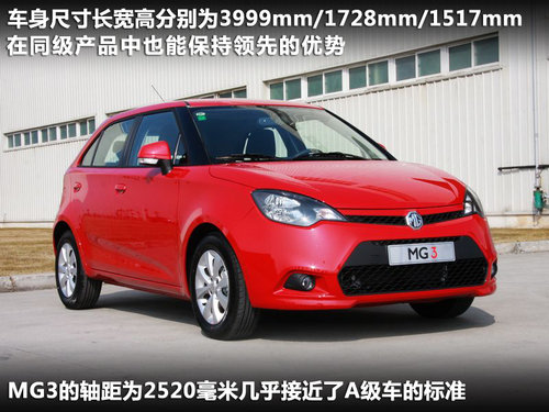 上汽MG3的车身尺寸长宽高分别为3999mm/1728mm/1517mm,轴距为2520mm,在同级产品中也能保持领先的优势。最难能可贵的是,MG3的车身宽度达到1728毫米,不仅使这款小车看上去更加敦实,而且也能提高车内的纵向驾乘空间。MG3的轴距为2520毫米,从传统意义上来讲,几乎接近了A级车的标准。而刚刚正式上市的大众POLO车型,也会因为MG3的到来,而受到最强烈的挑战。