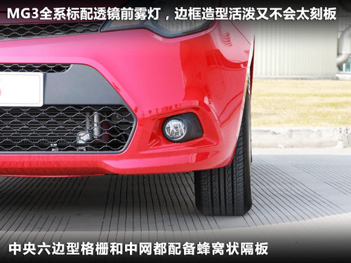 MG3全系标配圆形透镜前雾灯,而雾灯边框活泼又不会太刻板。犀利的运动风格是最为明显的设计基因,从遍布中央六边型格栅和中网的蜂窝隔板就能深刻体会。整车从前部看起来就小巧精悍,同时非常饱满。而这台潮车采用有骨雨刷,多少让我感觉有些意外。