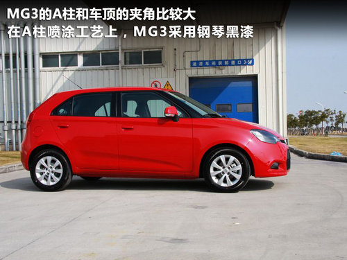 MG3的A柱和车顶的夹角比较大,这样可以提高前排驾驶员和乘员的头部空间,而且看上却也非常时尚。作为潮流型车,自然它有自己得意的地方,在A柱喷涂工艺上,MG3采用钢琴黑漆,使得整车前部视觉分层,更加具有动感。