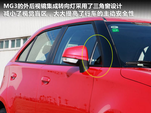 MG3的外后视镜集成转向灯采用了三角窗设计,减小了视觉盲区,大大提高了行车的主动安全性。而这样的设计在国内A0级别小车市场非常的少见。