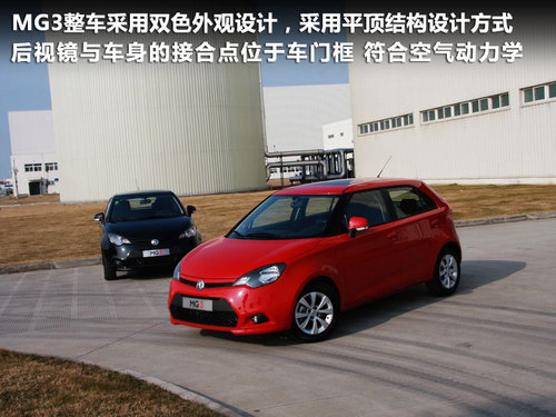 MG3整车采用双色外观设计,采用平顶的车顶结构设计方式,这一点与mini十分相似,该设计更符合年轻人的复古潮流。外后视镜集成了侧转向灯功能,并且它与车身的接合点位于车门框的最上沿,这更加符合空气动力学,为整车降低风阻。