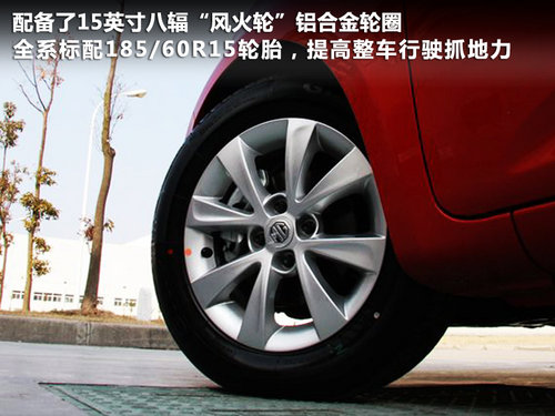 配备了15英寸八辐“风火轮”铝合金轮圈,看上去极具运动时尚气息。全系标配185/60R15轮胎,提高整车行驶的抓地力,这款车的轮胎扁平比为65,可适当提高车内乘员舒适性。