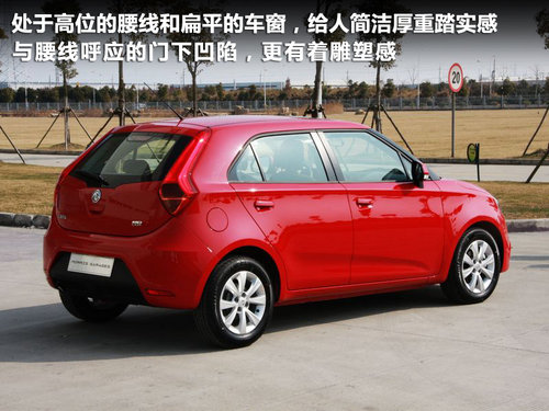 车身侧面硬朗的线条很别致,MG3较之前的MG 3SW变化颇大,不再走Cross路线。棱角分明的线条为欧系车型最为时尚的“Faceted Flow”流面切割设计的应用。处于高位的腰线和扁平的车窗,给人简洁而厚重踏实的感觉。与腰线呼应的门下凹陷,更有着雕塑感。