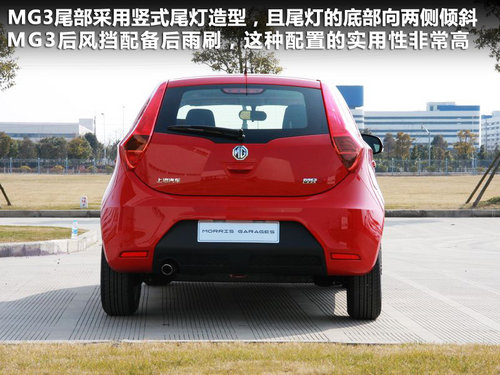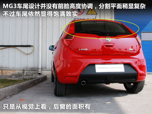 MG3车尾的总体设计并没有前脸高度协调,分割平面稍显复杂,前脸的运动风格和气势在这里也并没有得到充分的展现。不过车尾依然显得饱满敦实,掀背式的设计本身就代表着时尚和运动。只是从视觉上看,后窗的面积有些狭小了。
