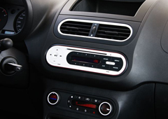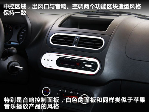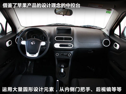 打开车门,进入MG3的内部,借鉴了苹果产品的设计理念的中控台,把“拿来主义”发挥的很好,科技感十足。这款车的中控台以及其他部件都采用白色的装饰板设计。运用了大量的圆形的设计元素,从内侧门把手、内后视镜到空调出风口、中央控制面板,甚至连变速器的面板造型都采用了同样的设计。