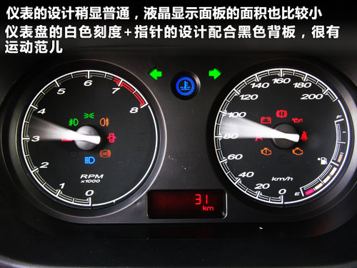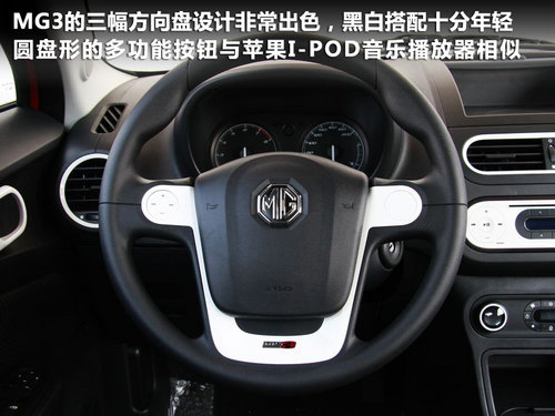MG3的三幅方向盘设计非常出色,黑白颜色搭配十分年轻,只是采用硬质塑料材质手感欠佳。圆盘形的多功能按钮与苹果I-POD音乐播放器十分相似,正是当下年轻人最喜爱的设计风格。相比之下仪表的设计稍显普通,液晶显示面板的面积也比较小。但仪表盘的白色刻度+指针的设计配合黑色背板,很有运动范儿。