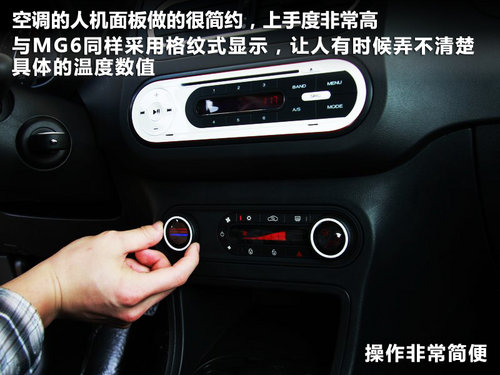 空调的人机面板做的很简约,上手度非常高,左边的圆圈转动代表温度的大小,美中不足是它与MG6同样采用格纹式显示,让人有时候弄不清楚具体的温度数值,但操作非常简便。中央按钮分别为AC模式,内循环,后窗加热,中控锁,和警示灯。右边的旋钮则为选择风量风口模式功能。
