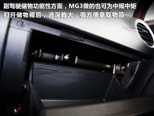 在副驾驶储物功能性方面,我想MG3做的也可为中规中矩,打开储物箱后,进深教大,很方便拿取物品。但经过仔细观察,发现储物箱完全打开后,储物机构内部未做教完整的密封处理,裸露了一小块车内结构,虽然并无大碍,但如果储物箱内物品不慎调入后面的车体内部,可能会带来一些小麻烦。