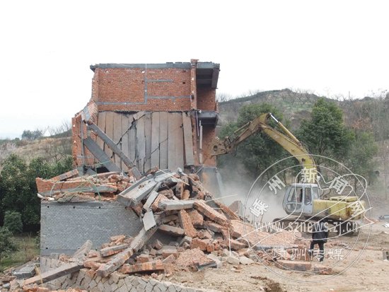 昨日上午10点30分左右,经过施工机械一个多小时的作业,嵊州市瑞意曲轴有限公司最后一幢建筑面积800平方米的三层综合楼,在漫天灰尘中轰然倒下(如图)。至此,全市十起土地违法典型案件之一——嵊州市瑞意曲轴有限公司未经批准非法占用金庭镇华堂村孝康自然村集体土地的违建厂房已被全部拆除。