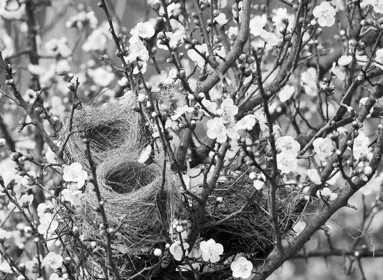 2月26日,在嵊州西景山村的一处梅花丛中,鸟儿的新家、勤劳的蜜蜂与梅花融成一张春日美景。 (记者 张亮宗 摄)