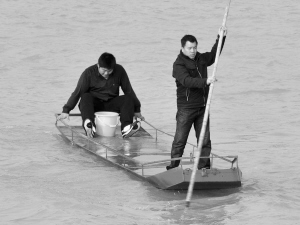 近年来,嵊州市投入重资对该市澄潭江、黄泽江、新昌江进行生态改造,使该市江河里鱼类等水产日渐增多,丰富了市民菜篮子。图为市民正在黄泽江里捕鱼。 (记者 张亮宗 摄)