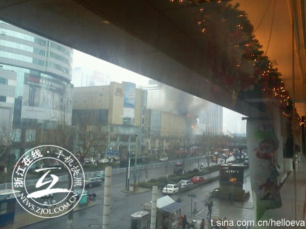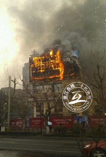 浙江在线3月1日讯(记者 李敏 施宇翔 廖小清 童俊 徐晓 王坚颖/摄)今天中午12点左右,浙江在线接到网友报料称,位于杭州体育场路和延安路口的国大城市广场外墙脚手架起火,现场火光冲天。