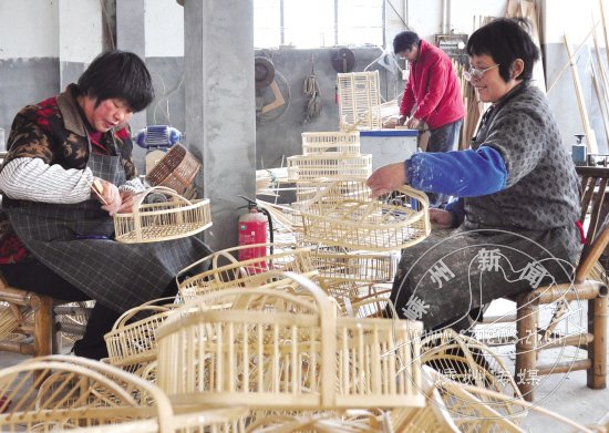 盘、毛巾桶等实用型的竹编产品是我市竹编企业外销的主力产品。今年开春以来,我市各竹编生产企业订单不断,因人手紧张,许多企业都在组织人员加班生产。图为昨日黄泽镇青石桥村的国森工艺竹编厂里,工人们在车间里加工竹编制品。