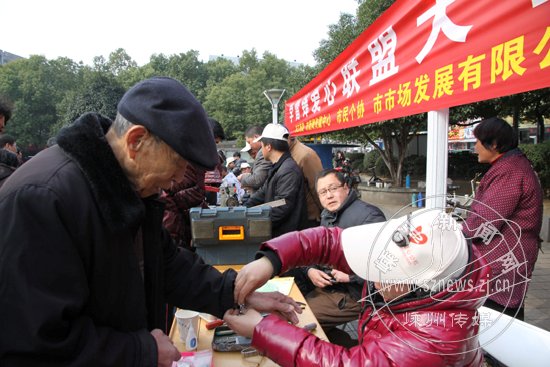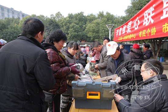 市新闻传媒中心携手市个体劳动者协会今日上午在中心广场、阳光山庄(市级敬老院)开展了“学雷锋爱心联盟大行动”。活动现场,为群众及老年人提供测血压、理发、修理家电、钟表、鞋类、手机等10多个项目,各服务摊位前人头攒动,居民群众络绎不绝。