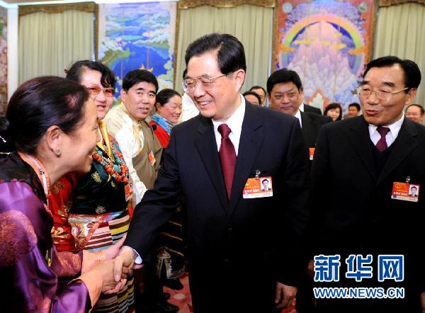 3月6日,中共中央总书记、国家主席、中央军委主席胡锦涛参加十一届全国人大四次会议西藏代表团的审议。这是胡锦涛同代表们亲切交谈。新华社记者 李学仁摄
