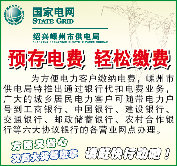 为鼓励广大城乡居民电力客户通过银行代扣的方式缴纳电费,让大家轻松缴费、满意用电,嵊州市供电局隆重推出“预存电费 轻松缴费”为主题的电费抽奖活动。具体事项如下:一、活动时间及奖项设置