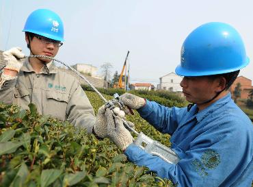 新华社照片,嵊州(浙江),2011年3月4日 浙江嵊州专电供应保春茶 3月4日,电力员工在浙江省嵊州市崇仁镇应桂岩村安装供电设施。 嵊州市供电部门在今年茶叶采摘前,加大电力设施改造,确保该市10多万台炒茶机械电力供应。嵊州市共有茶园18万亩,是全国重点产茶区之一。 新华社发(张亮宗 摄)