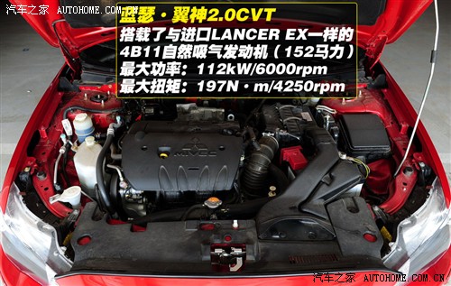 翼神搭载三菱4B11 2.0L进口发动机,发动机最大功率112kW(152Ps)/6000rpm,最大扭矩197N·m/4250rpm,如果更偏好运动或者驾驶的乐趣,挡位清晰的5挡手动变速箱是最好的选择,可以更好的将2.0L发动机的动力及时反映出来。如果长期在城市中驾驶,平顺的CVT变速箱则首当其冲。