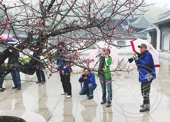 书圣王羲之晚年归隐处为道家“第二十七洞天”,被唐代文学家裴通称“越中山水奇丽,剡为最;剡中山水奇丽,金庭洞天为最。”近日春暧花开,沿途梅开正艳,引来各地游客观光。图为3月6日,市摄影家协会组织的摄影采风团一行在金庭王羲之故居旅游区拍摄。