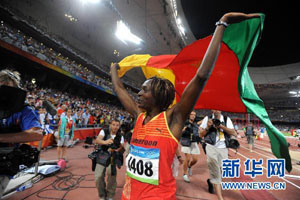 图为2008年8月17日,喀麦隆选手弗朗索瓦丝·姆班戈·姆邦戈在夺冠后庆祝。她在北京奥运会女子三级跳远决赛中以15米39的成绩夺得金牌。新华社记者李尕摄
