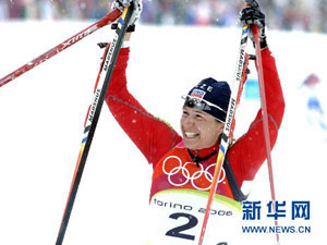 图为2006年2月24日,卡特琳娜·诺伊曼诺娃在比赛结束后欢呼。她在都灵冬奥会越野滑雪女子30公里集体出发的比赛中获得冠军。新华社记者王长山摄