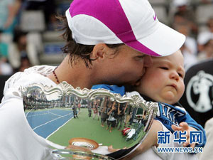 图为2008年1月5日,达文波特领奖后亲吻儿子。她在新西兰举行的奥克兰网球精英赛女子单打决赛中,以2比0战胜法国选手雷扎伊,获得冠军。新华社发