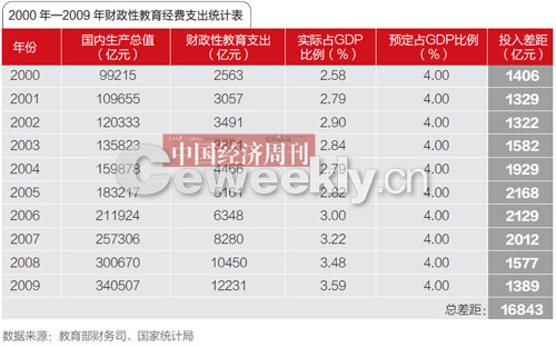 根据教育部财务司、《中国统计年鉴2009》及国家统计局公布的数据计算,从2000年到2009年10年间,以4%的比例为目标,则国家财政性教育经费支出10年累计“欠账”已达16843亿元。2002年到2003年间,经费投入甚至还出现了0.06%的倒退。截至2009年,国家财政性教育支出12231.09亿元,占国民生产总值的3.59%。
