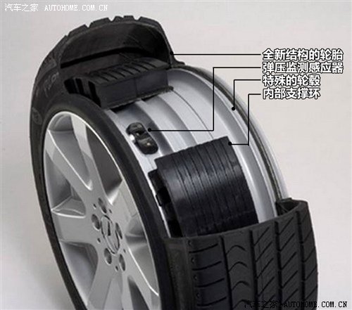 米其林的防爆胎系统被称之为PAX轮胎系统,是在1998年发明的,由全新结构的轮胎、特制的轮辋、内置支撑环和胎压探测器四部分组成。