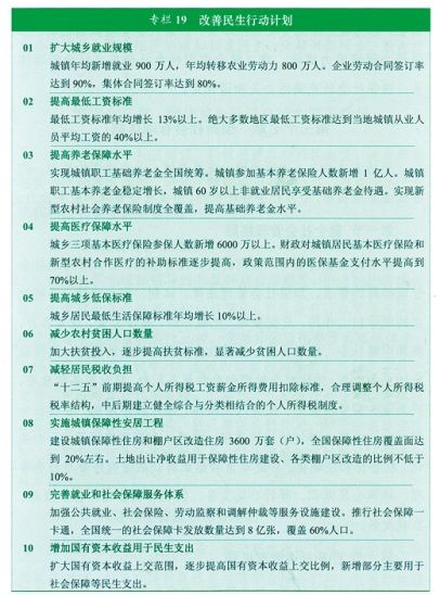 “十二五”规划纲要草案首次以专栏的形式提出“改善民生行动计划”,明确十大举措。城镇年均新增就业900万人、最低工资标准年均增长13%以上、建设城镇保障性住房和棚户区改造住房3600万套(户)……一个个具体数字,生动地诠释着“改善民生行动计划”,让人备感温暖。一项项民生举措,勾画出充满希望的民生画卷,让亿万群众真切看到党和政府保障和改善民生的决心。