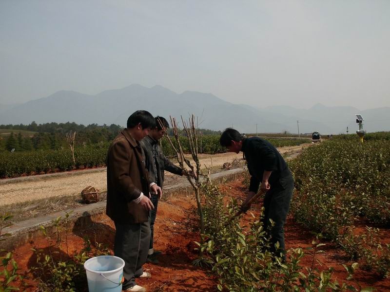 近日阳光明媚,正值植树的黄金时节,浙江省第一个国家级标准化茶园(创建)、越乡龙井主要名茶基地————嵊州市黄泽明山茶场,场员们正抓紧在辽阔的数千亩已改造的名茶基地的道路两旁种植道路林,通过全面绿化,努力把5000亩名茶基地打造成为效益高,景色美,集生态、观光、经济高产于一体的国家级标准化名茶园。