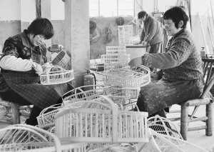 用竹子制成的盘、毛巾桶等实用型竹编产品是嵊州竹编企业外销的主力产品。今年开春以来,嵊州市各竹编生产企业订单不断,许多企业都在组织人员加班生产。图为嵊州黄泽镇沙地村国森工艺竹编厂里,工人们在车间里加班加点。【来源:天天商报】