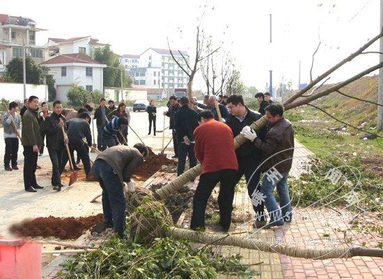 阳春三月,春暖花开,一年一度的植树节即将到来。3月8日,市建设局组织建设系统干部职工60余人,开展义务植树活动,在湿地公园沿堤路旁种植香樟树230余株。图为植树现场。
