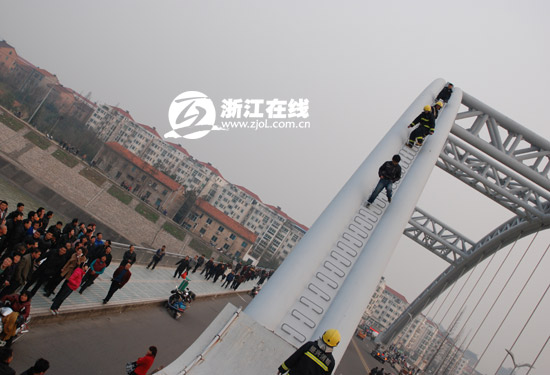 9日下午4点半左右,一男青年偷偷爬上了嵊州大桥从三江街道往嵊州市区一侧的桥拱顶,临江面站立,该男子情绪激动,不时晃动身体,而站离处距离桥面30余米高,一旦坠落,极其危险。