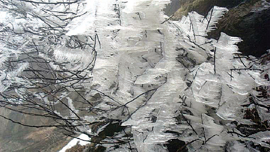 多么神奇的冰雪世界!白白的冰,粘在树枝的周围,晶莹剔透,特别好看。有好多冰只粘在树枝的一边,也许是风的作用吧;也有立在树枝上方的,令人称奇。有的冰长度达30-40厘米,使人想起挂在风中的拉面。