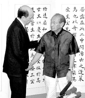 3月10日,在日本冲绳县那霸,美国驻日本大使鲁斯(左)向冲绳县知事仲井真弘多道歉。鲁斯当日与仲井真弘多举行会谈,就马厄发表侮辱冲绳人的言论表示道歉。新华社发
