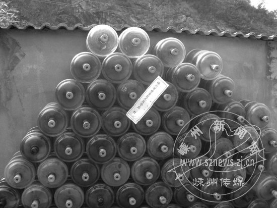 执法小组人员在检查中发现,3家企业有早期采购的无“QS”标志饮用水罐在使用,立即责令企业停止使用无证饮用水罐,并当场对这些无“QS”标志的饮用水罐予以封存处理,杜绝无“QS”标志饮用水罐继续流通。图为被执法人员查封的不合格饮用水罐。